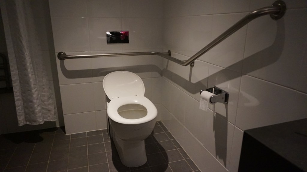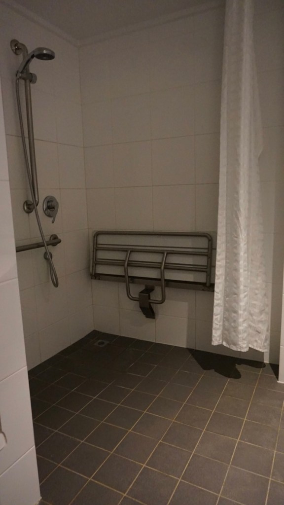La habitación adaptada está bastante bien. Me recordó a las americanas, habitación y baño muy grande. El baño tiene un pequeño lavabo con espacio para dejar el neceser y un espejo inclinado a perfecta altura que se agradece mucho, el retrete está bien ubicado para hacer la trasferencia y poder pasarse al mismo, este baño dispone tambien de bañera y ducha pudiendo elegir la que mejor os venga en función de vuestras necesidades.