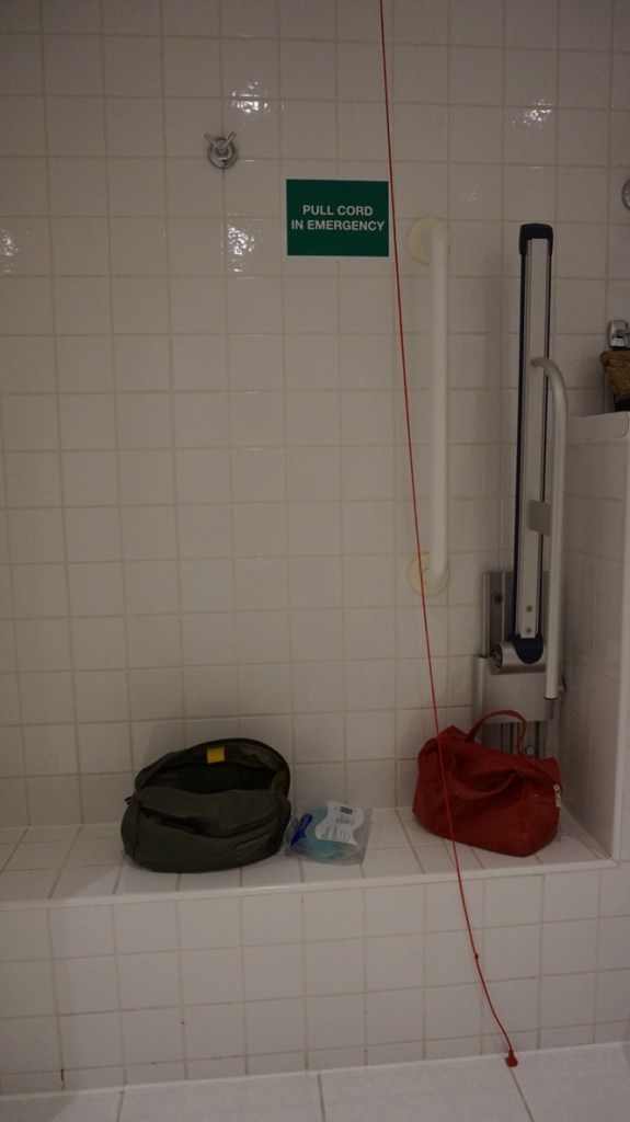 El baño es algo antiguo pero muy amplio con todo tipo de barras, tanto en el retrete como en la ducha, que es abierta y por cierto con timbre de seguridad por todas sus zonas.