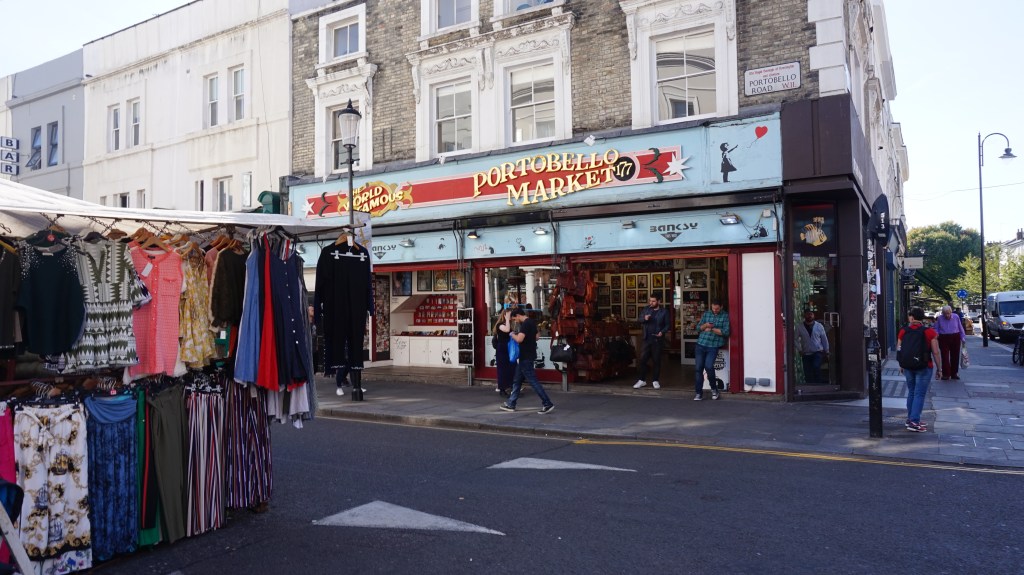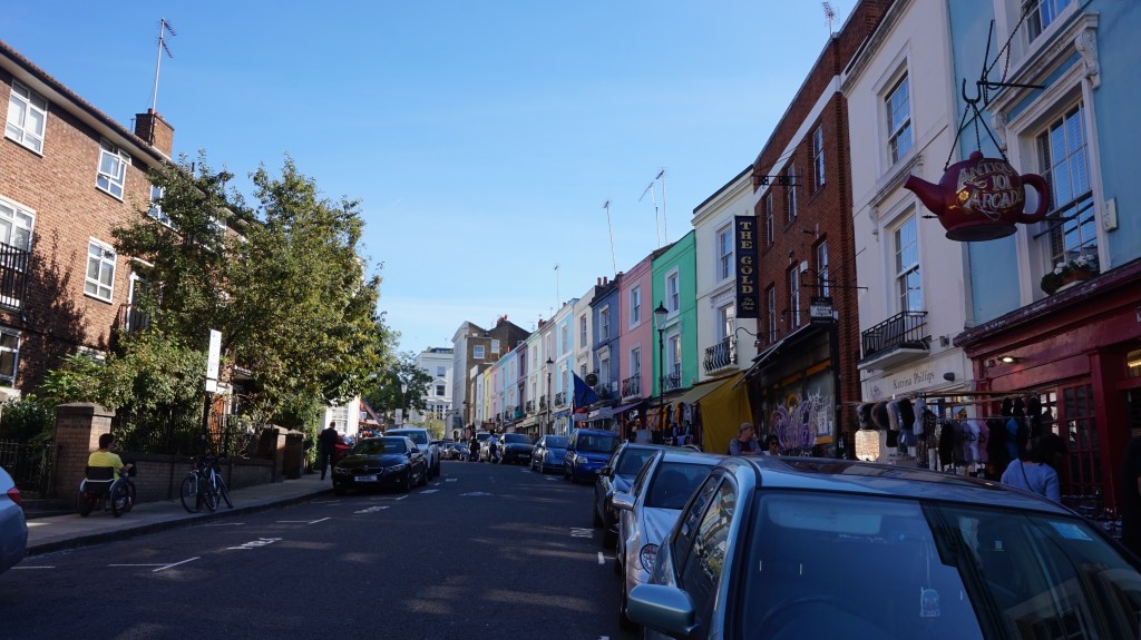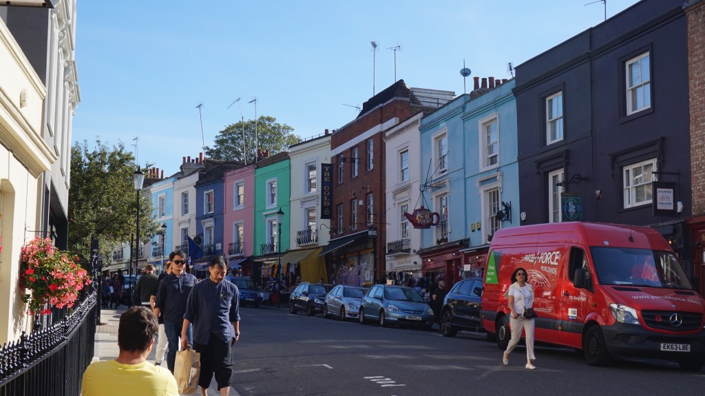 Desde el Science Museum cogimos el bus turístico para acercamos hacia Notting Hill y su famoso mercado de Porto Bello conocido por sus puesto de antigüedades, comida y ropa. Este mercado está situado en medio de una calle y está abierto todos los días aunque su día fuerte es el sábado. El mercado al encontrase en una calle con unas aceras un poco altas no es muy cómodo para andar en silla salvo que andes por medio de la carretera. Os lo recomiendo si os va ese rollo de antigüedades.