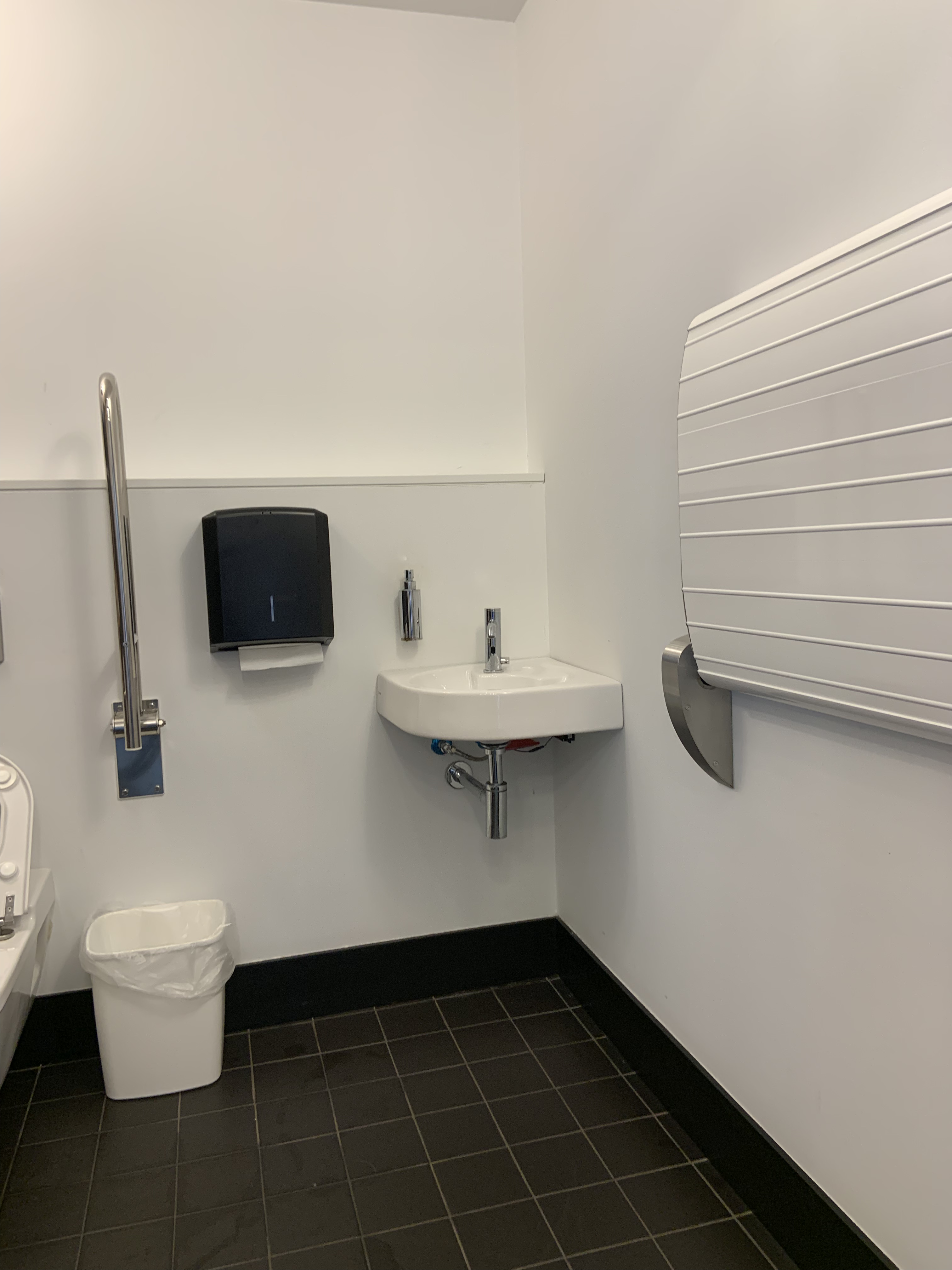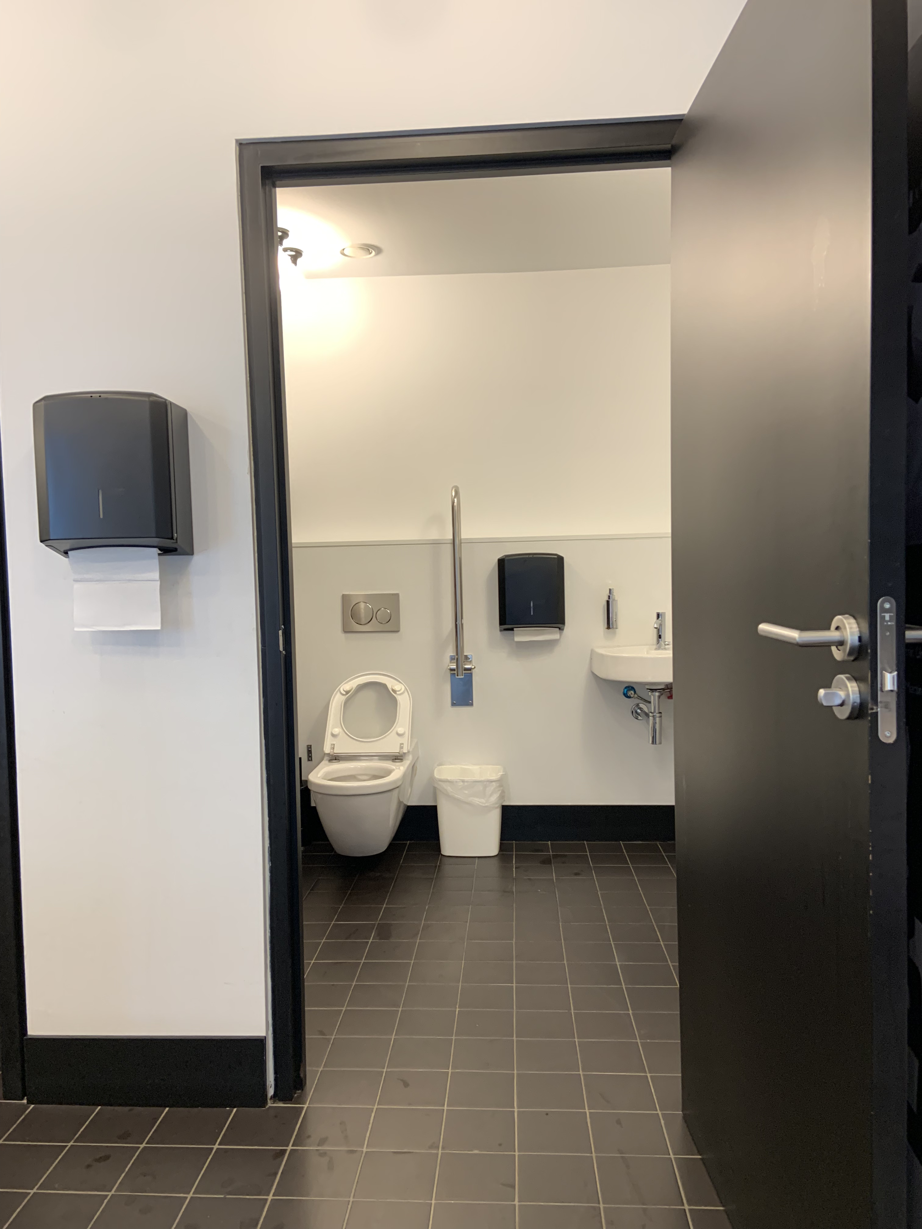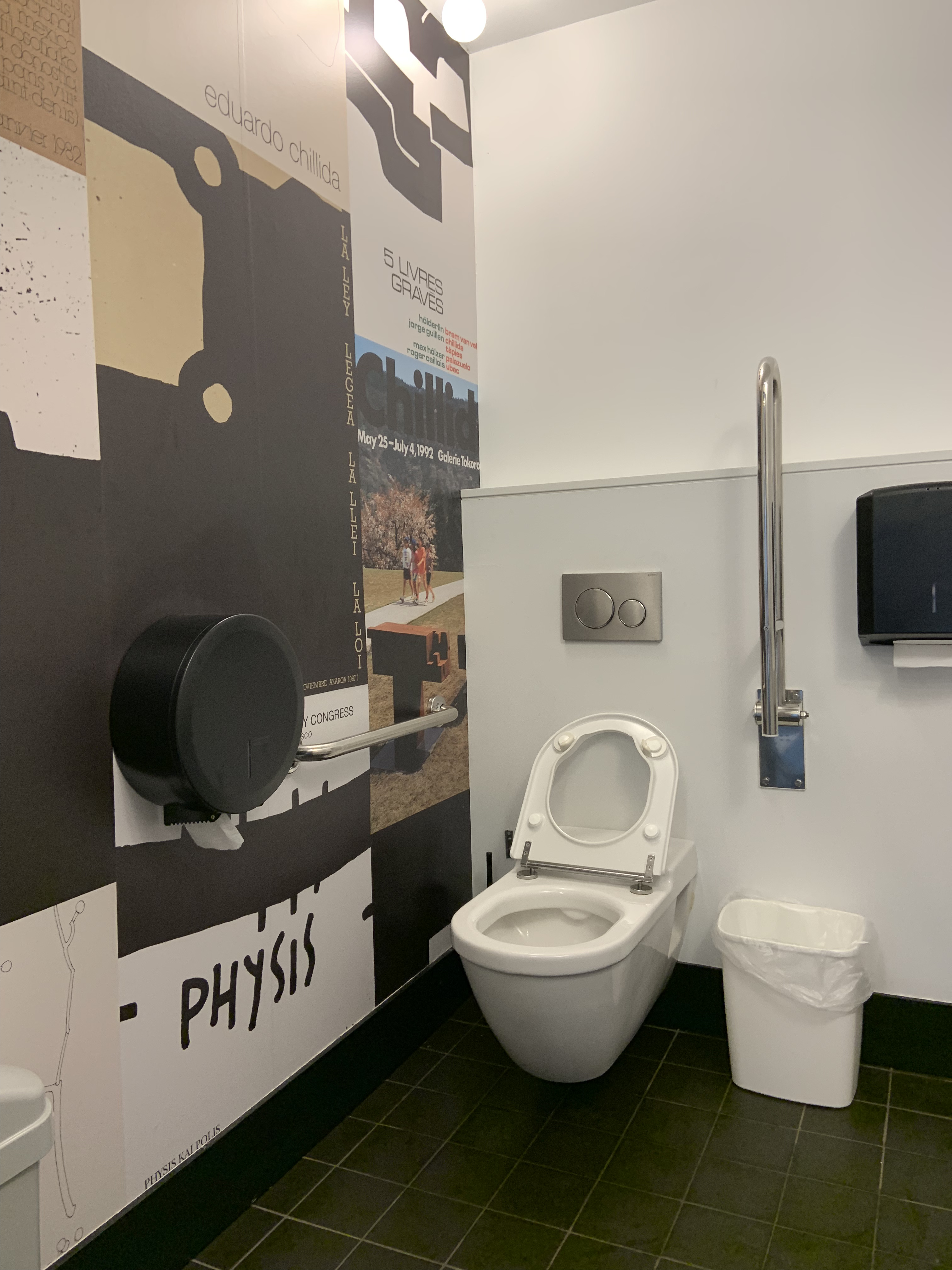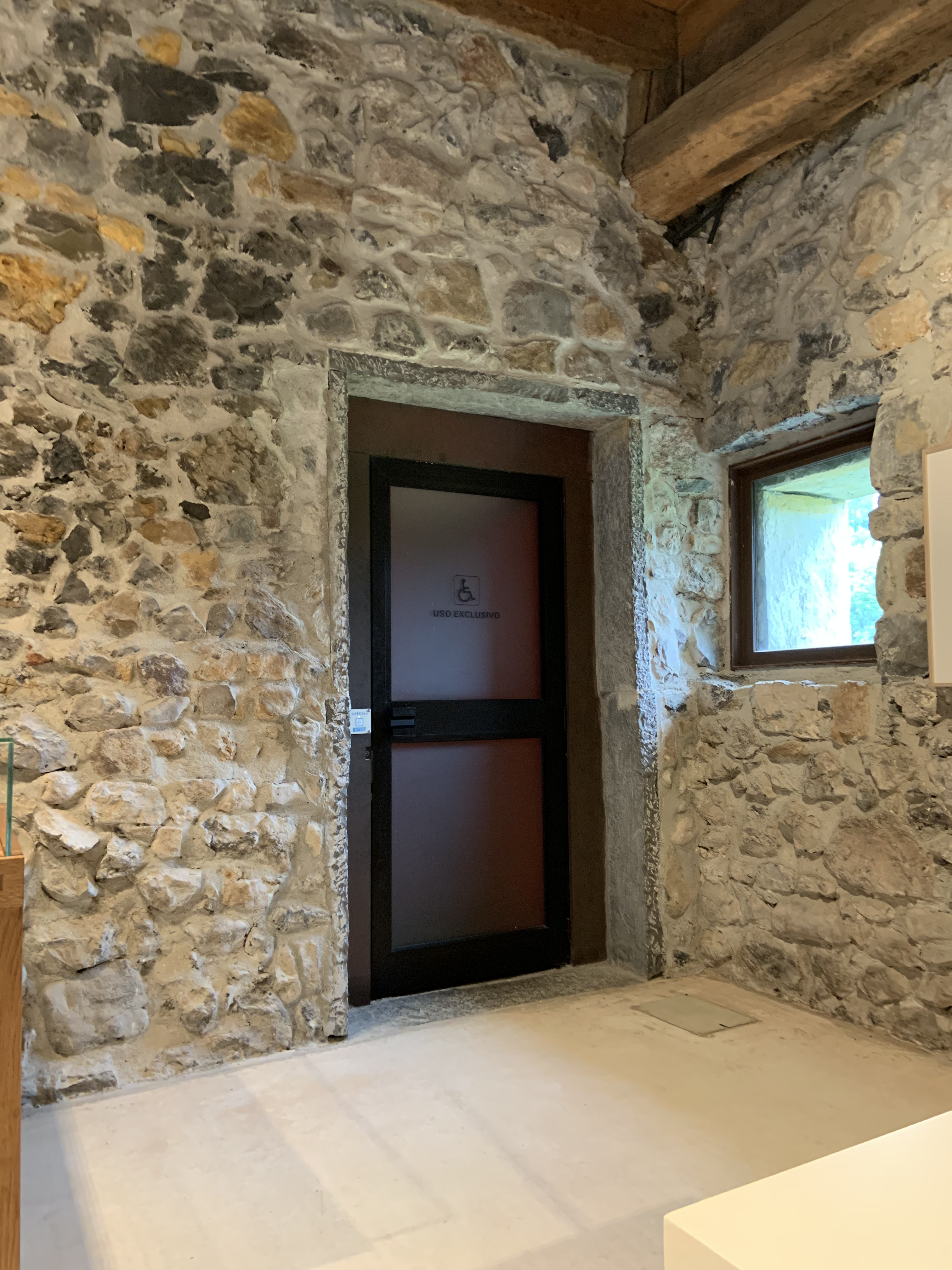 En la zona baja justo al lado de la entrada están los baños y entre ellos hay uno reservado para personas con movilidad reducida que está perfectamente equipado.