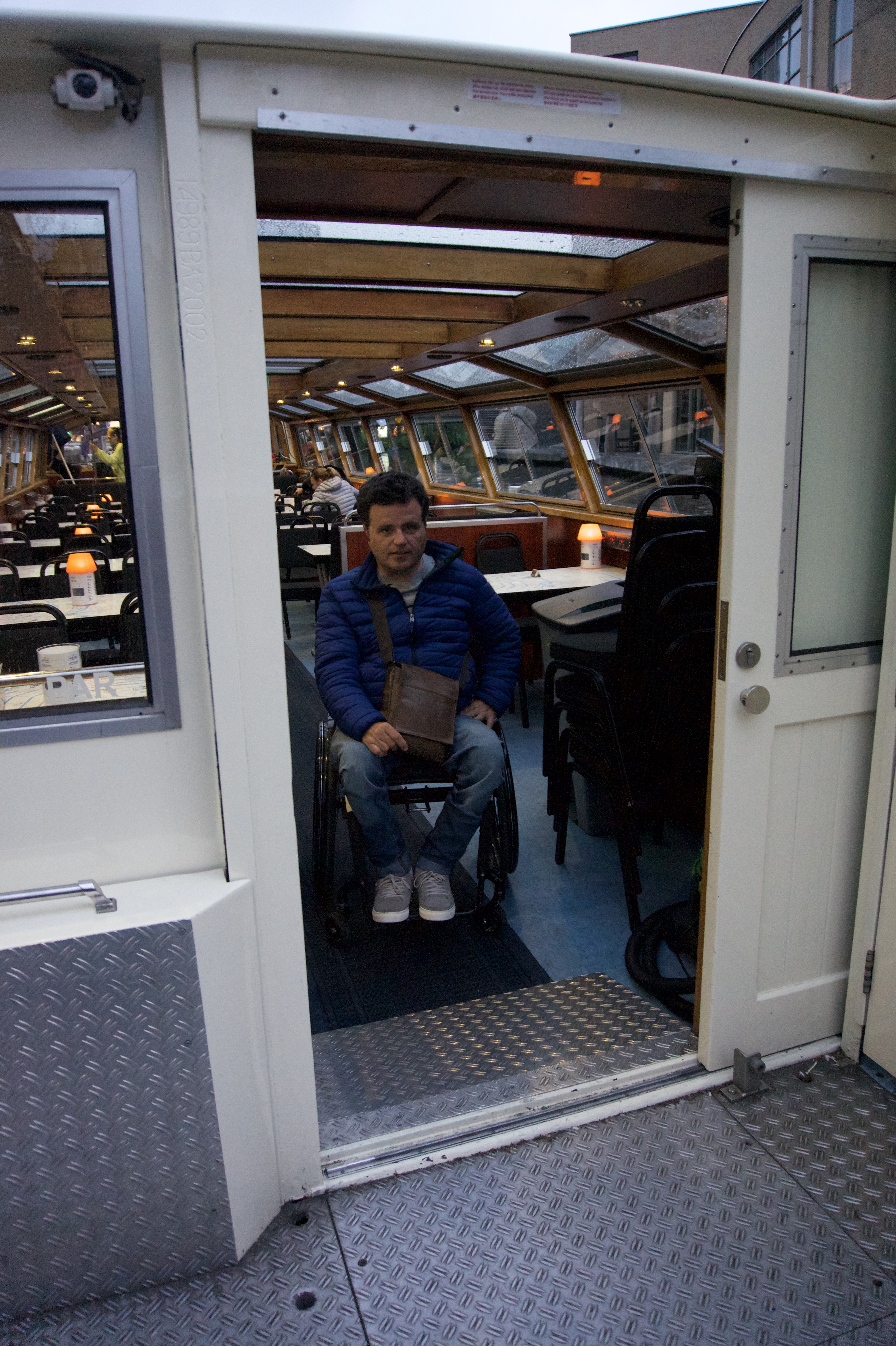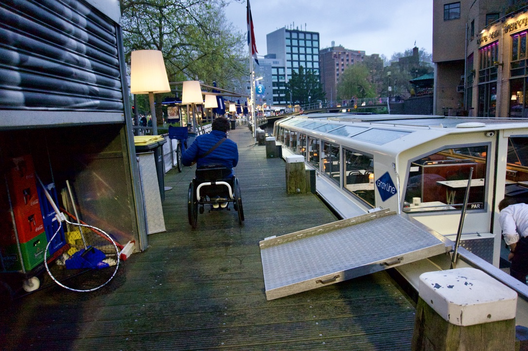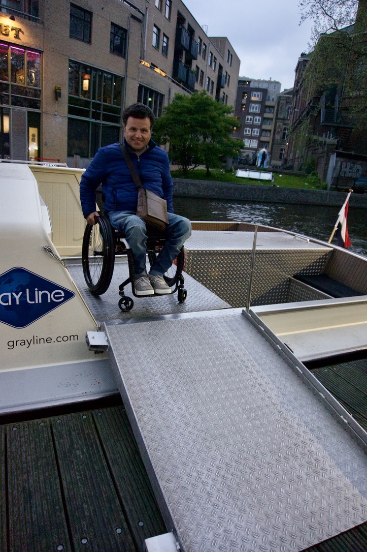- Crucero Canales Amsterdam. Para lo último, otro de los imprescindibles en Amsterdam es hacer un Crucero por los Canales. Existe una compañía llamada Blueboat que te lo permite. Nosotros reservamos el de la última hora 19:30 y es una experiencia muy recomendable, por lo que me explicaron solo tienen un barco adaptado. A la hora de hacer la reserva en el formulario hay que poner que eres usuario de silla de ruedas y las limitaciones que puedes tener. Pasado unos días me confirmaron vía mail la hora exacta y lugar donde embarcar. Está situado justo detrás del Restaurante Hard Rock. Una excursión de 1:30h muy chula por los canales. El barco dispone de una baño pero NO es adaptado.