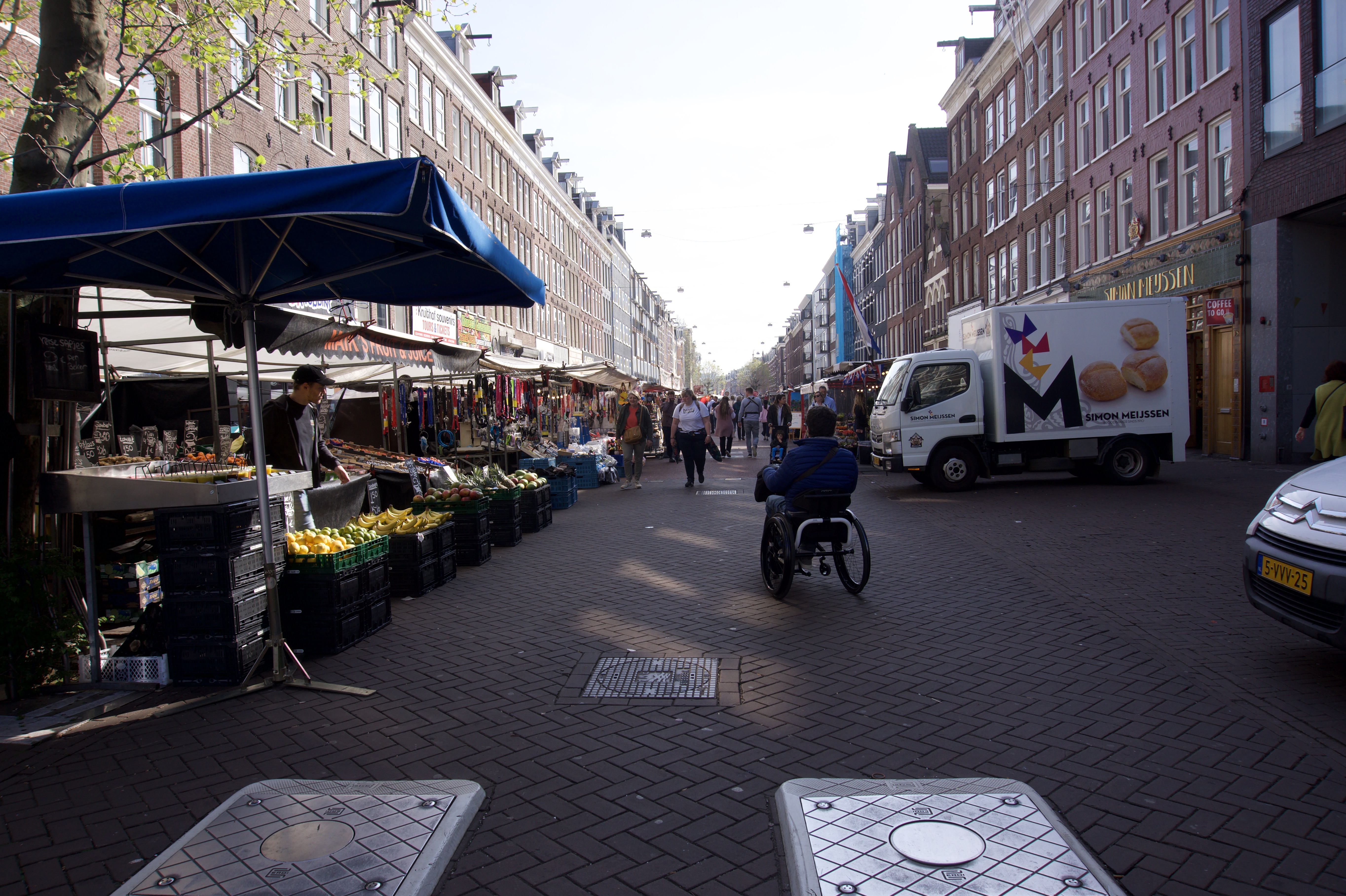 - Mercado de Albert Cuyp : Situado en el barrio PIJP es un mercado muy curioso, es una larga calle que las propios comercios que están a sus lados sacan todo su género al exterior. Podéis encontrar cualquier cosa: desde una pescadería, tienda de zapatos y ropa, comida en vivo o tienda de animales, muy curioso. Para llegar a él desde el centro es recomendable coger el tranvía nº24, en nuestro caso lo cogimos en Amsterdam Centraal y bajamos en la parada Amsterdam Marie Heinkenplein, el mercadillo se encuentra en una calle asfaltada y es muy fácil su tránsito en silla de ruedas. Está abierto de lunes a Sábado.