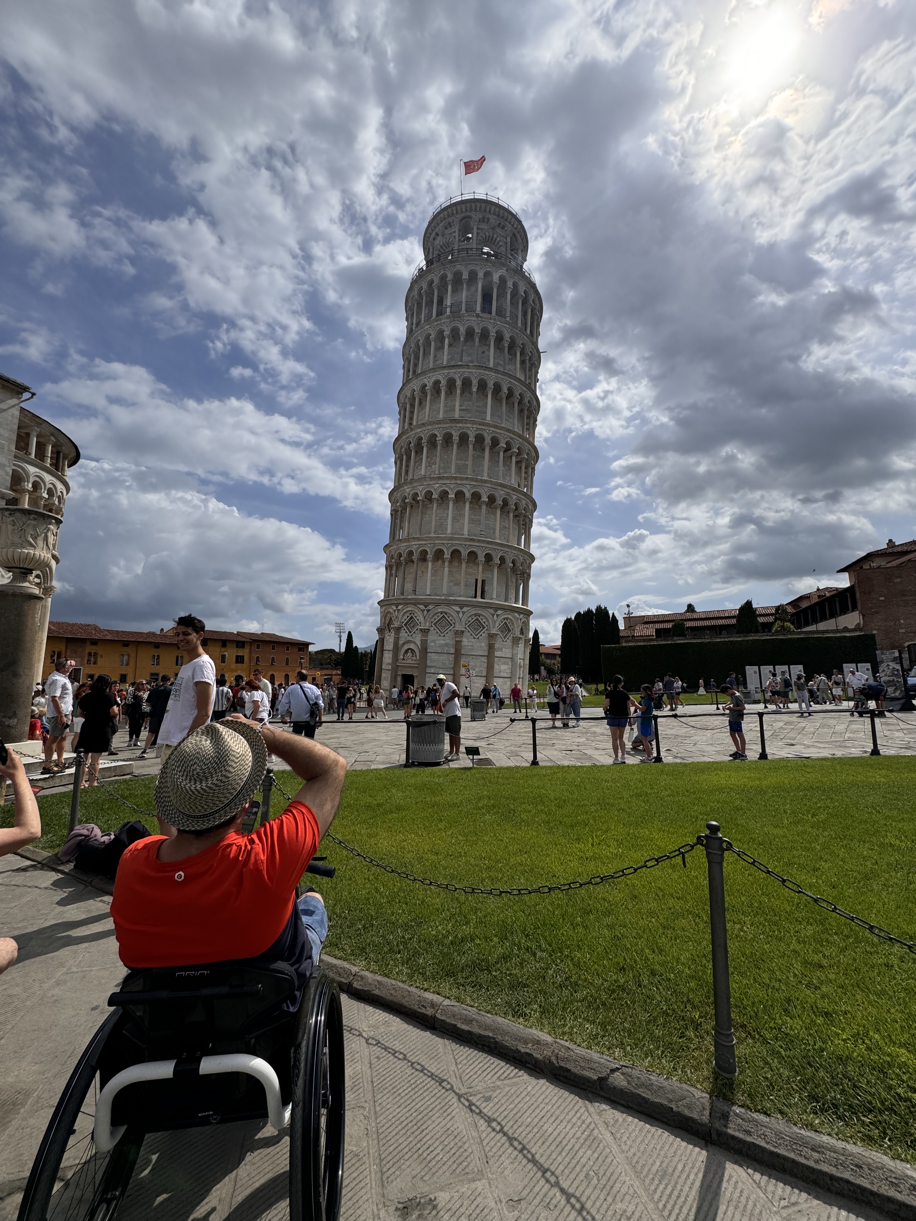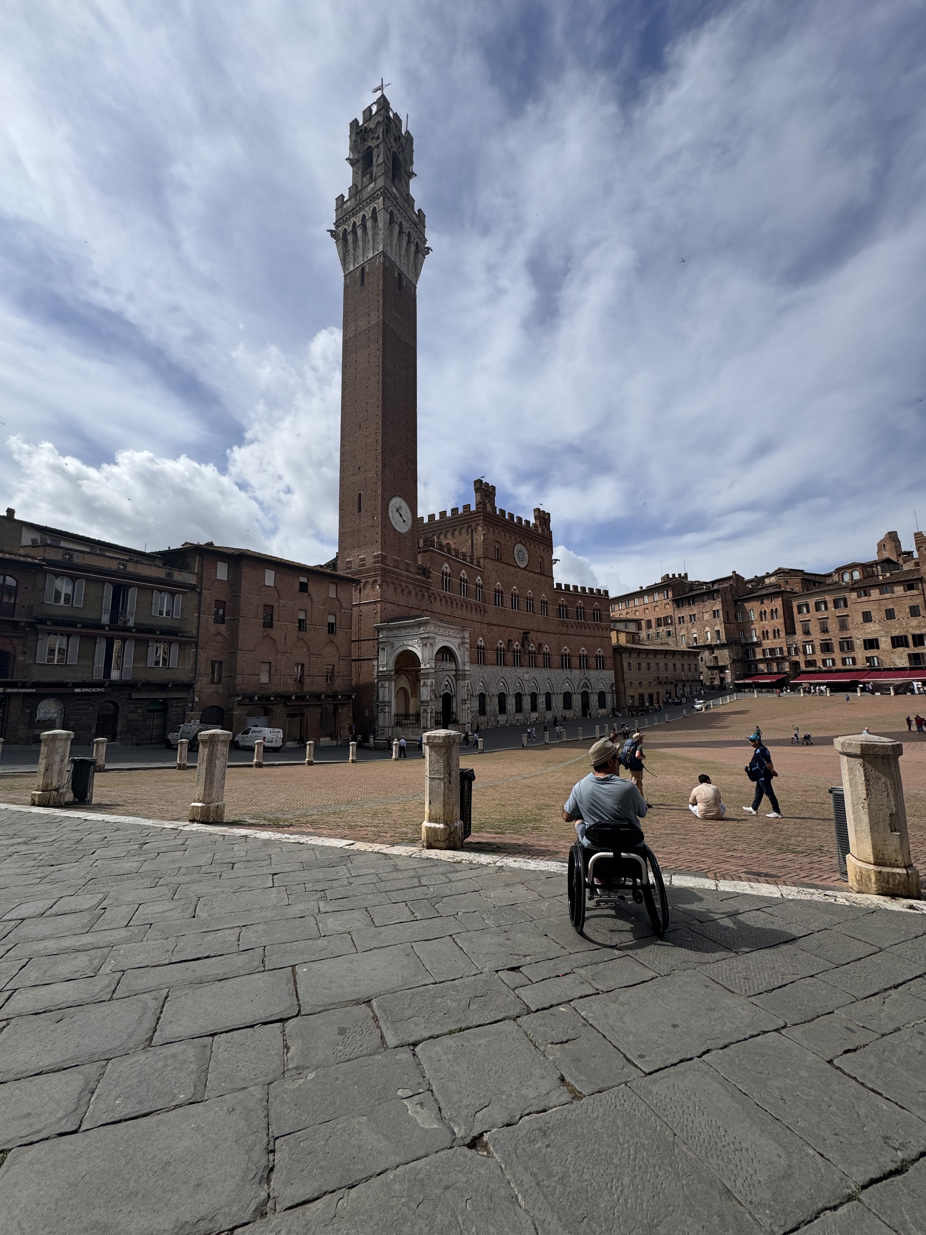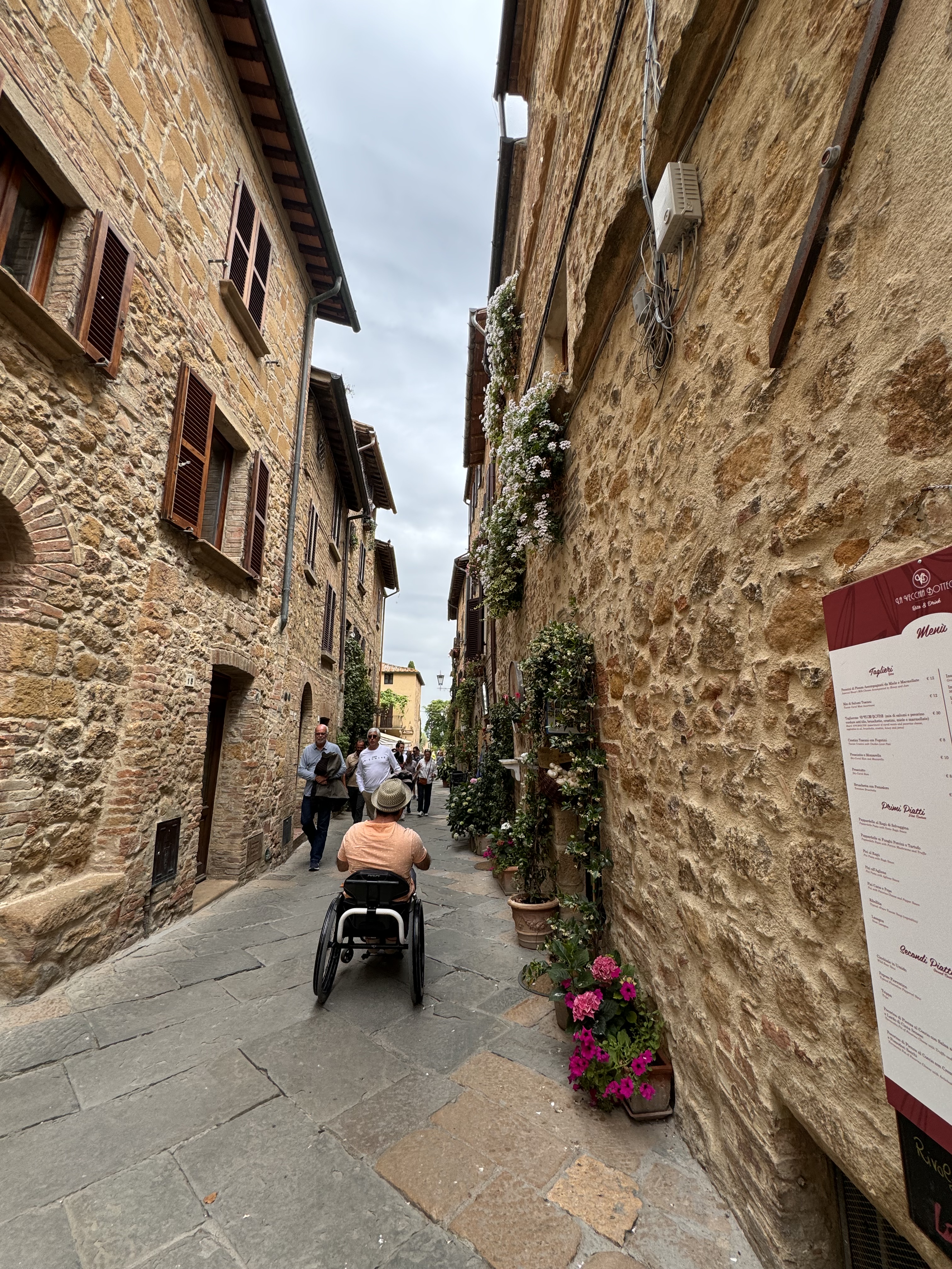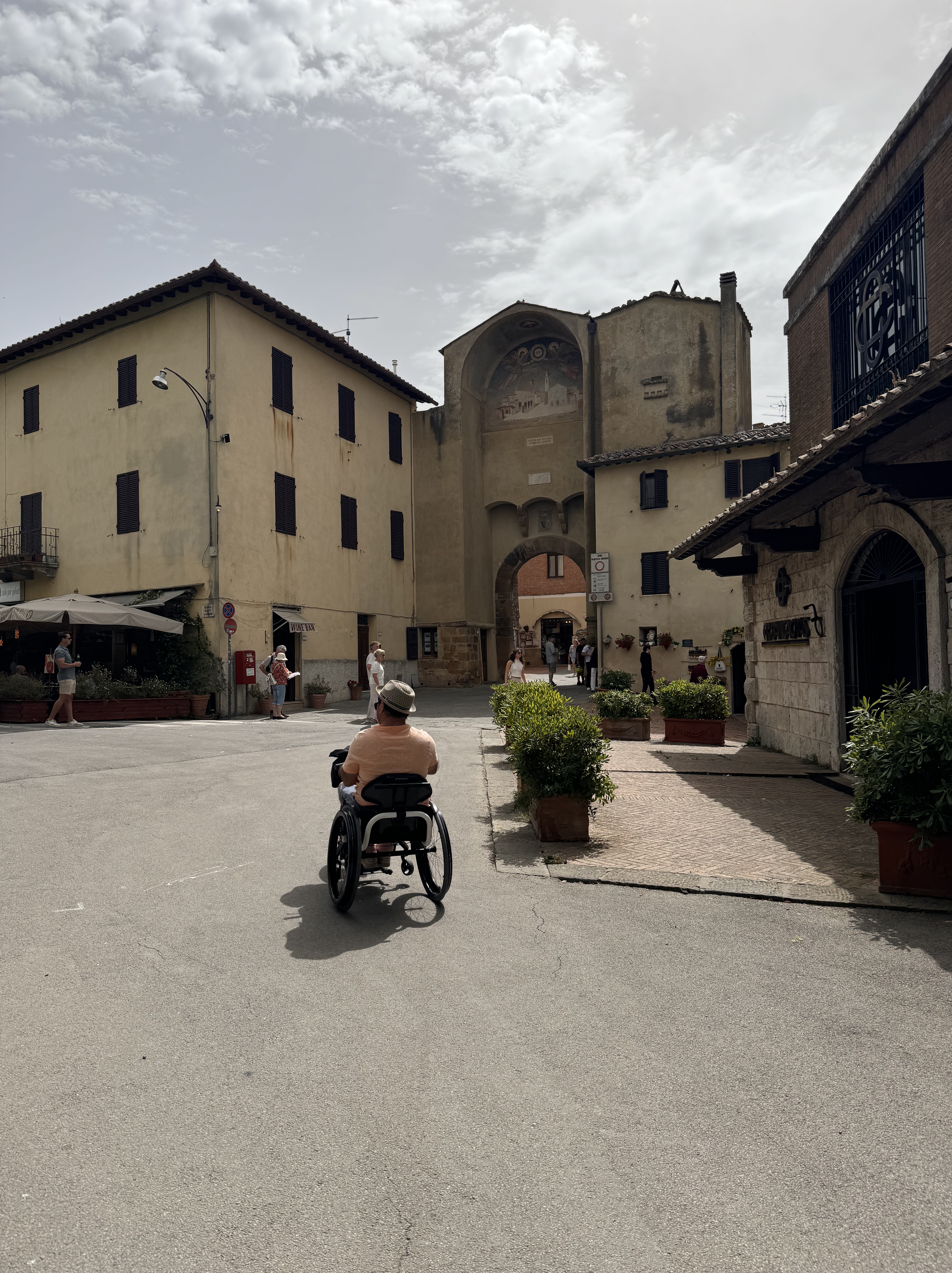 Estos pueblos/ciudades de la Toscana como norma general son adoquinados y con cuestas y no son fáciles pero no por ello no son accesibles. Yo siempre he encontrado un acceso algo más fácil cuando he visto que era difícil el acceso. Igual sin la handbike eléctrica habría sufrido más. Deciros que en casi todos los pueblos he encontrado baños adaptados gratuitos si no era por la calle dentro de algún lugar publico como parking etc.