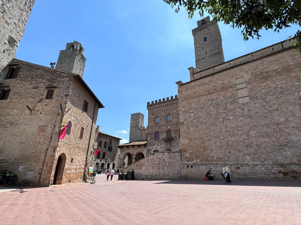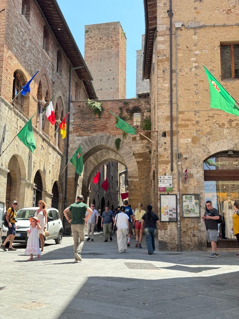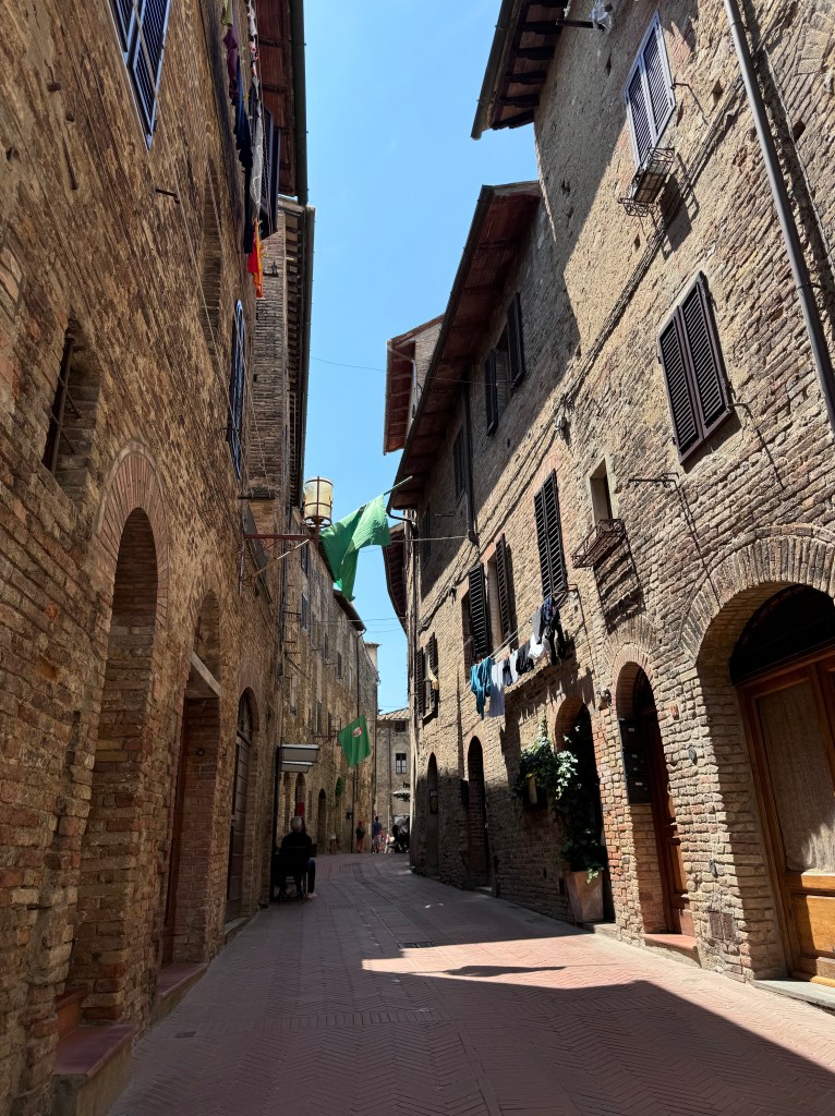 - San Gimignano es un pueblo medieval amurallado, sus torres lo hacen visible desde la lejanía, sus calles son adoquinas pero con un adoquin moderno muy transitable; eso sí, hay cuestas para llegar a su parte alta donde esta ubicada la Piazza della Cisterna, su zona centro no es accesible con el coche ( solo vecinos), nosotros lo aparcamos en uno de sus parking que lo rodean y a través de una ascensor accedimos al pueblo. En función del parking tendrás que coger ascensor o no. En la misma plaza central hay un baño accesible gratuito y perfectamente adaptado. Las calles de San Gimignano son de película , hay que perderse por ellas y aprovechar para tomar y comer cosas típicas de la zona.
