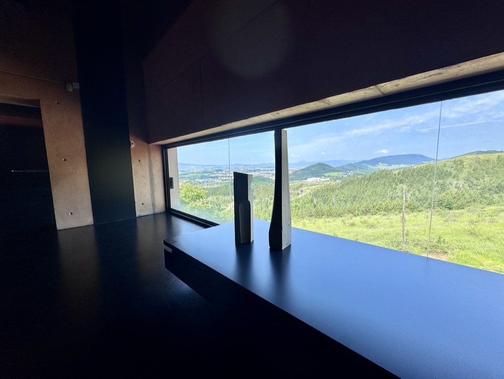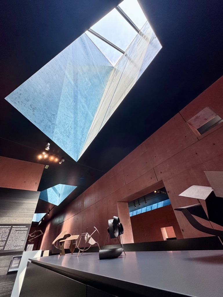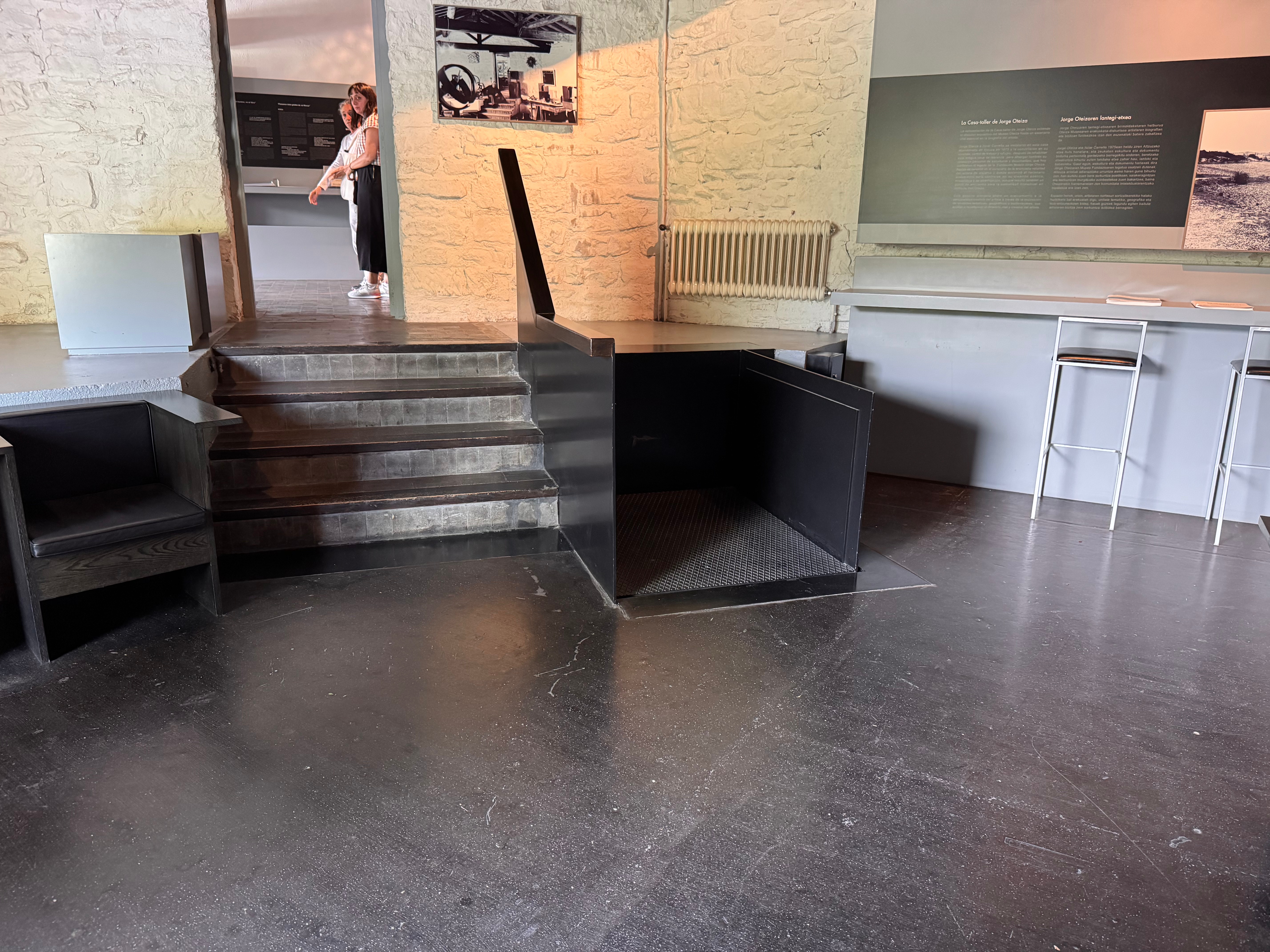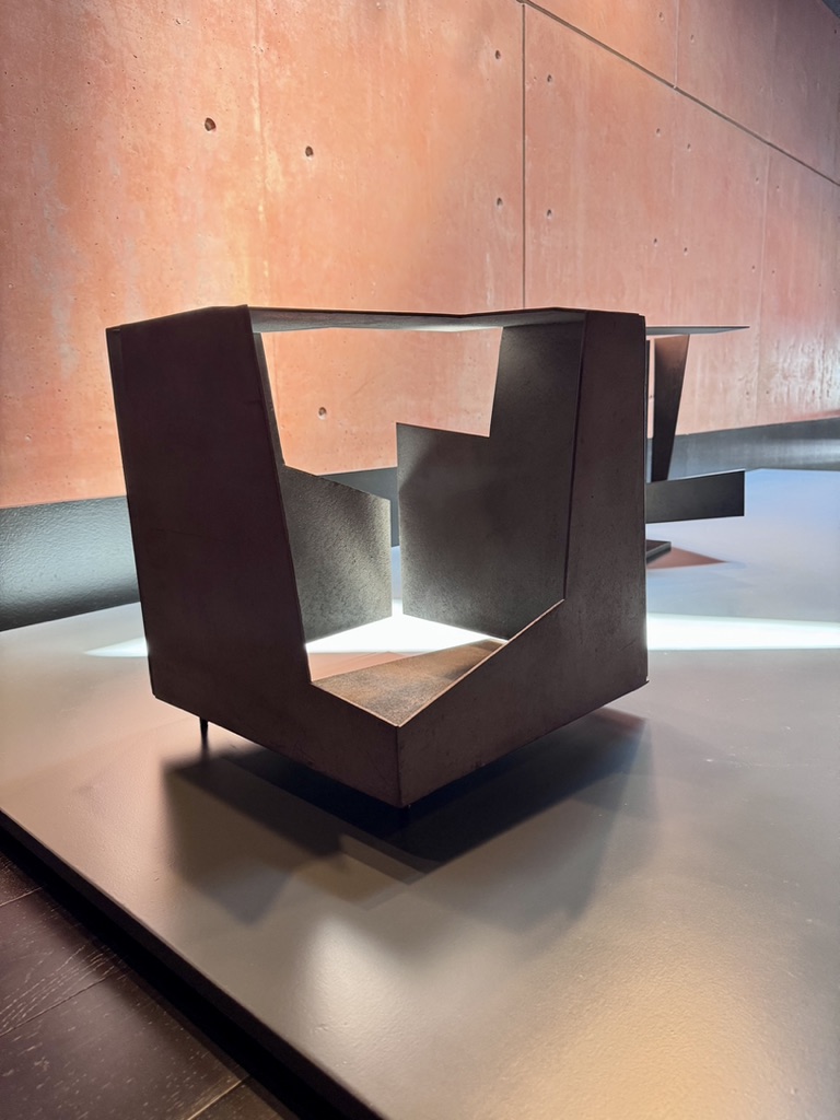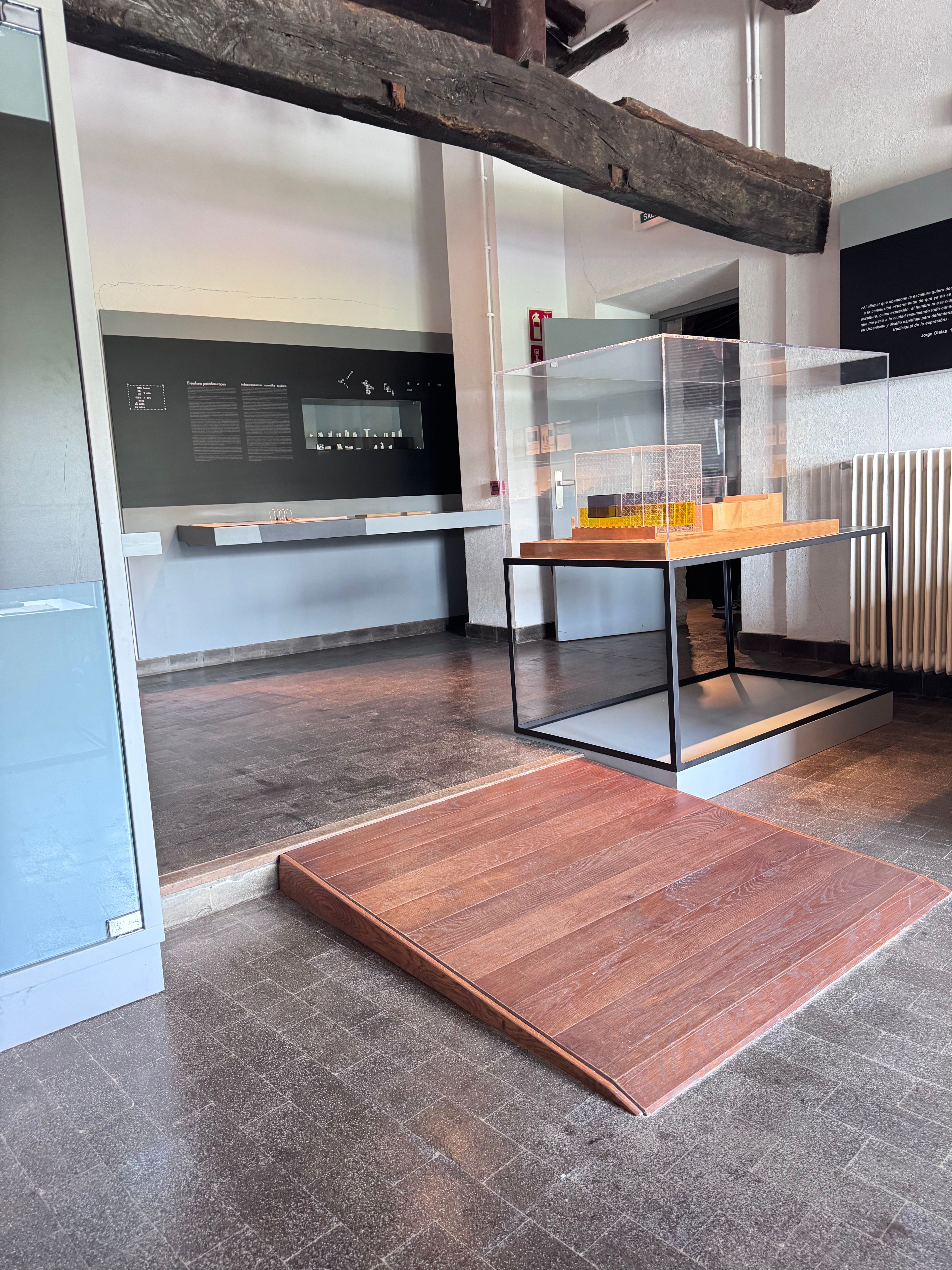 - Zona Museo: Al entrar por la puerta de piedra original de la casa y una vez pasada la taquilla, llegas al edificio nuevo y te das cuenta de lo especial que es este edificio. El hormigón, en su mayoría visto, tiene un color naranja rosado que lo convierte en un lugar acogedor, eliminando esa frialdad que transmite el hormigón sin tratar. El edificio está dividido en diferentes plantas: la inferior alberga exposiciones itinerantes de diversos artistas; la planta de entrada y la primera planta están dedicadas a las obras de Oteiza, así como a su impresionante biblioteca. Existe la posibilidad de utilizar rampas para desplazarse por su interior, aunque también dispone de ascensor. Si lo visitaís en silla de ruedas, os llamarán la atención muchos detalles, pero sin duda el que más me impactó fue la altura de las ventanas en las paredes, que nacen en su gran mayoría desde el suelo. Parecía como si estuvieran diseñadas para ser vistas por usuarios de silla. No sé si el artista en aquella época ya utilizaba silla de ruedas o si querían conseguir esa entrada de luz desde el suelo; seguramente sería lo segundo… quién sabe. Si tenéis la suerte de visitar el museo en un día soleado, podréis ver cómo las entradas de luz atraviesan sus obras dándoles vida a gran parte de ellas. Recuerdo un comentario que me hizo un trabajador del museo diciéndome que el museo cambia completamente de la mañana a la tarde por el simple hecho de las entradas de luz. Entre las obras podréis encontrar las réplicas de los famosos apóstoles de la Basílica de Arantzazu, las desocupaciones de diferentes prismas y esculturas, así como el famoso Laboratorio de tizas.