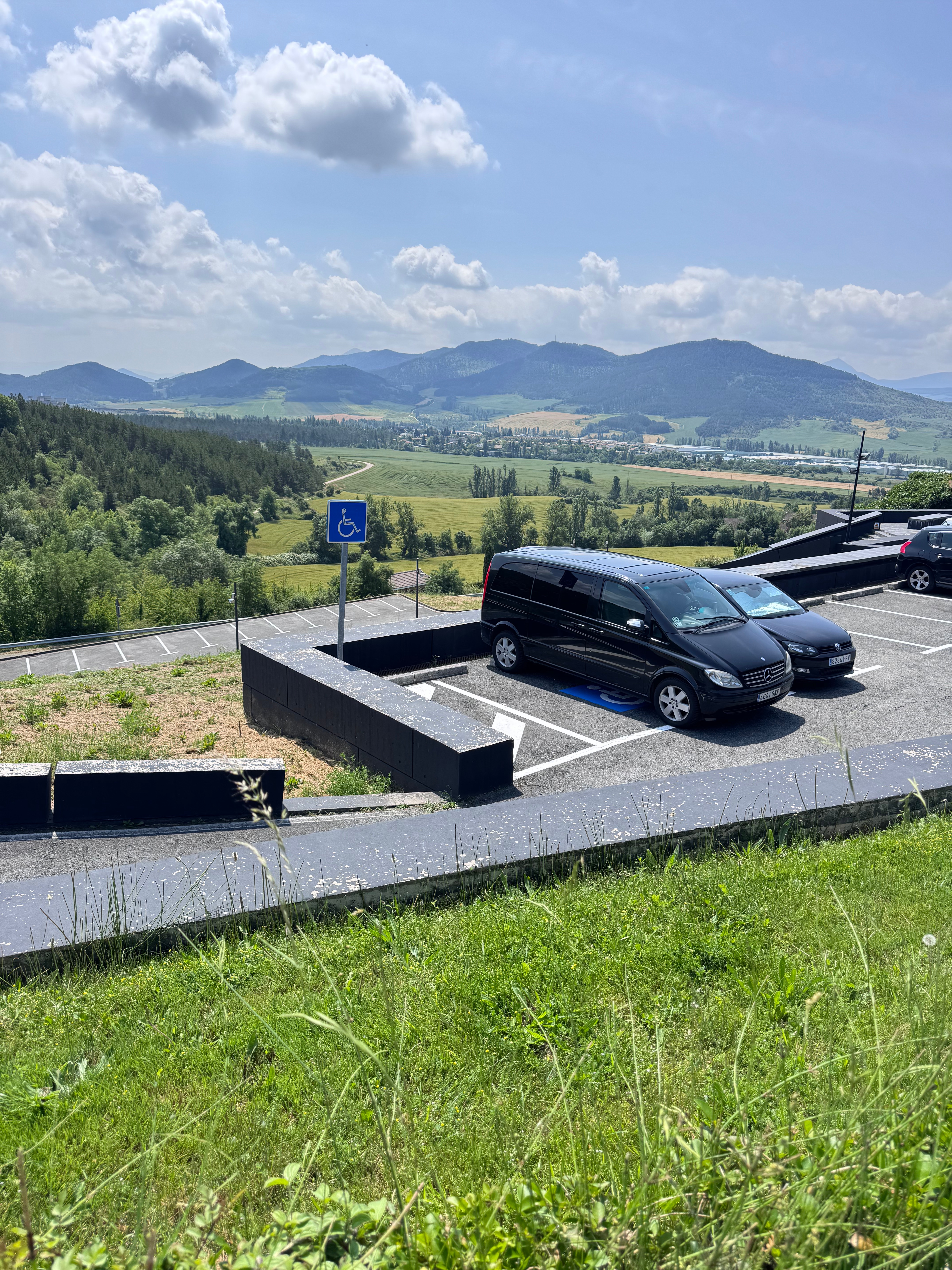 Como os decía, el museo se encuentra en un alto, y la zona del parking está dividida en dos zonas: vamos a llamarle la baja y la alta. En la baja está el parking principal (coche, autobuses, etc.), y la alta, que está a pie de entrada del museo, es donde están ubicadas las plaza de PMR y unas cuantas plazas de coche reservadas.