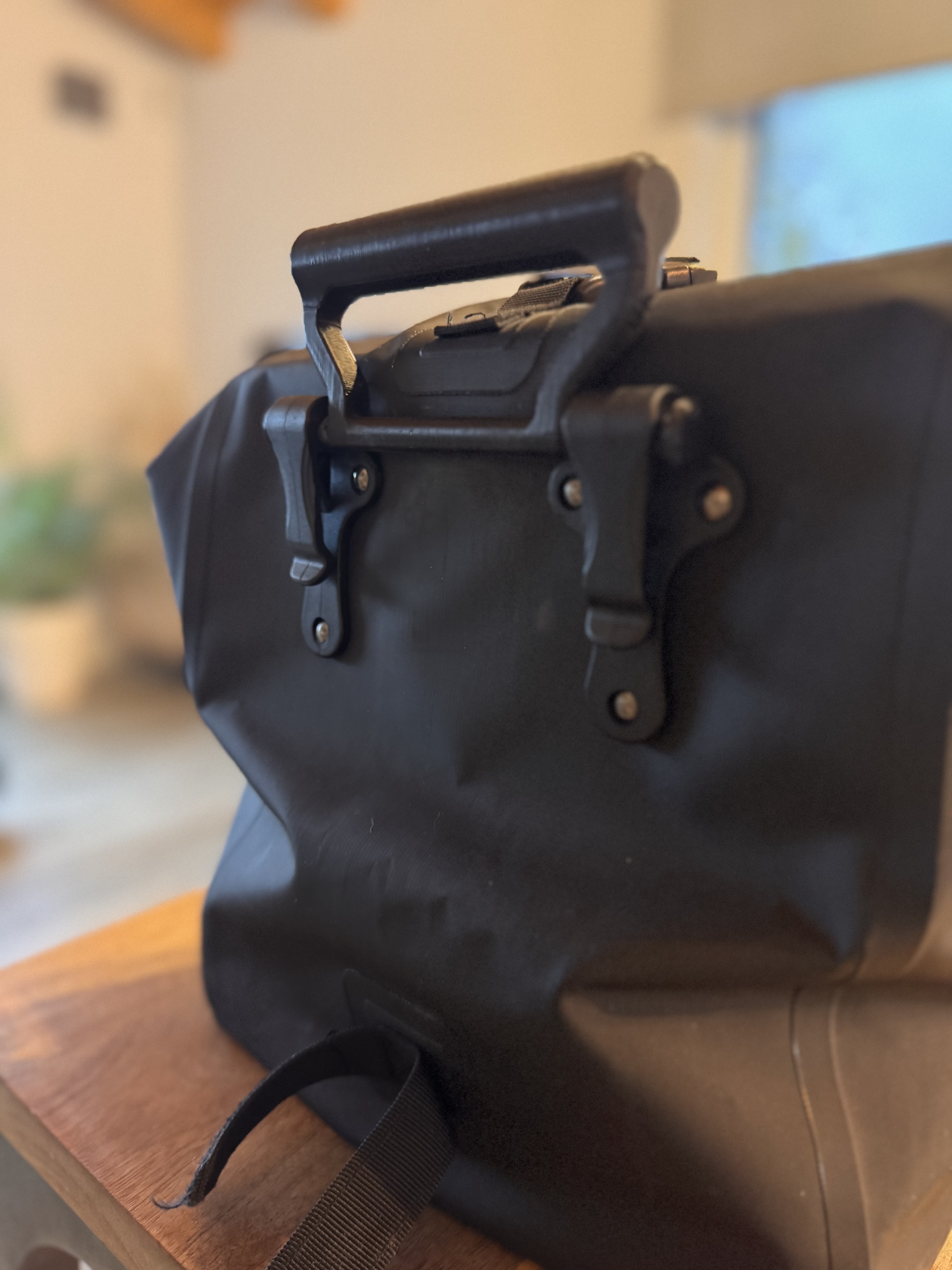 - Bolsa frontal: Fundamental en una silla viajera. Probé varios diseños hasta dar con el que me ha funcionado. Está formada por una bolsa tipo alforja (Aliexpress) y dos soportes hechos en 3D, ojo no es un bolsa para soportar grandes pesos, es ideal para ropa y accesorios no muy pesados, a diferencia de la bolsa antigua de Batec esta por su diseño gira con el manillar :