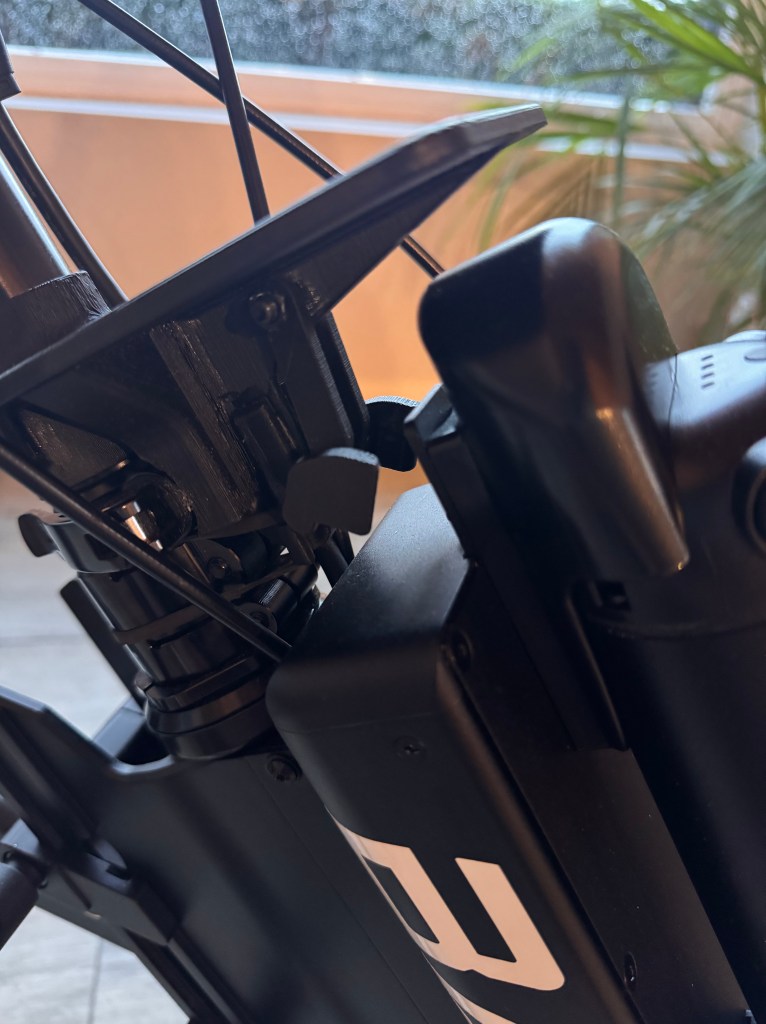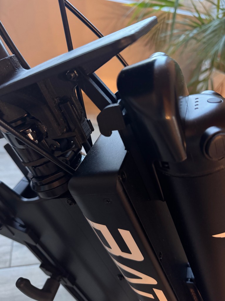 - Antigiro manillar: Como mencioné antes, la Batec tiende a girarse hacia la derecha por su diseño en reposo; este soporte evita el giro abrazando el soporte de la batería, impidiendo el movimiento del manillar, totalmente mecánico y manual.