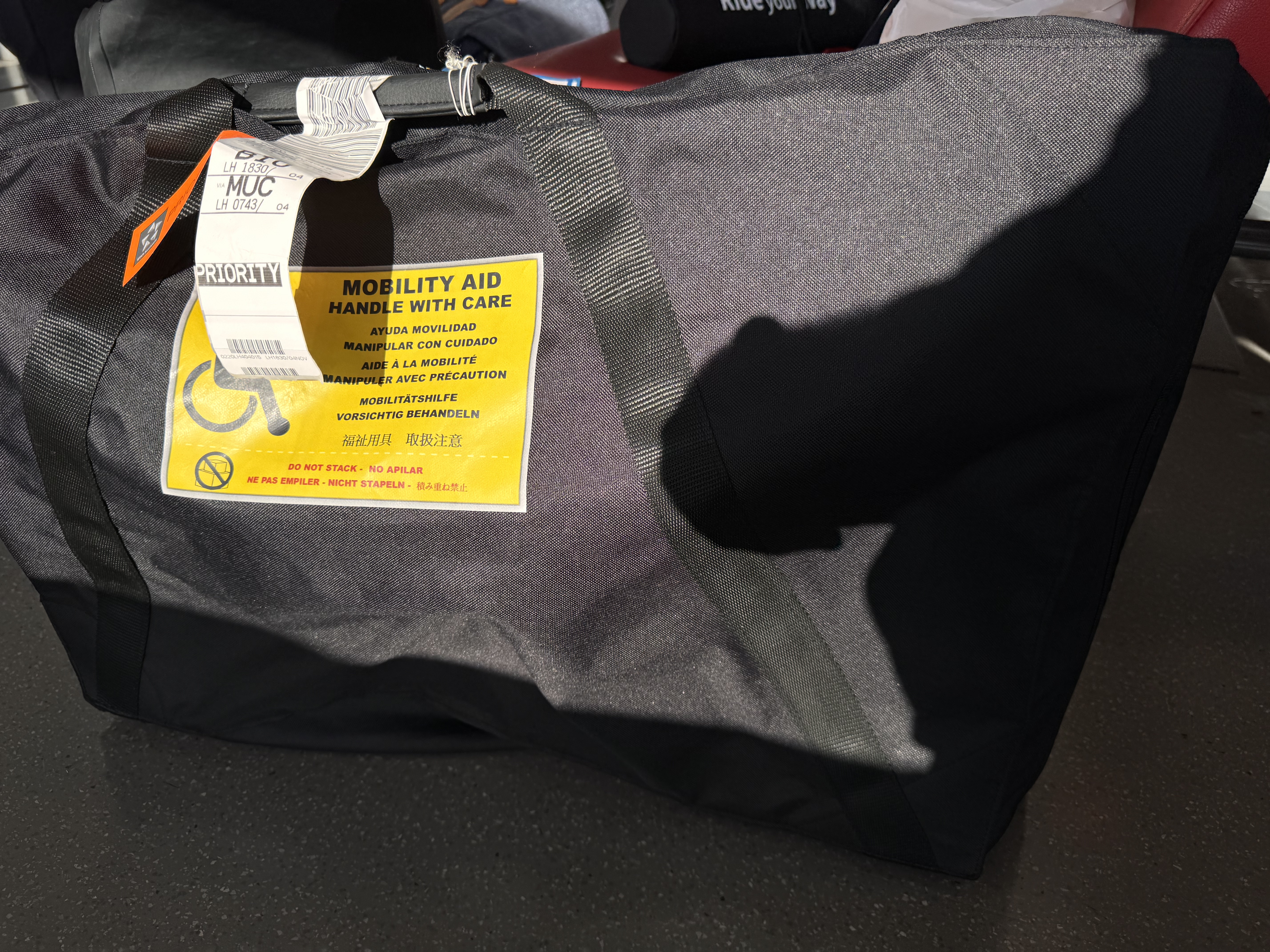 - Bolsa de transporte: He añadido indicaciones llamativas en varios idiomas avisando que el contenido es delicado y requiere cuidados en el transporte. Igual soy un poco radical pero bajo mi punto de vista la bolsa tendría que ser de un color llamativo y con indicaciones, de esa forma siempre llamaría la atención de los operarios que la manipulen. ( avión, tren, taxi etc )