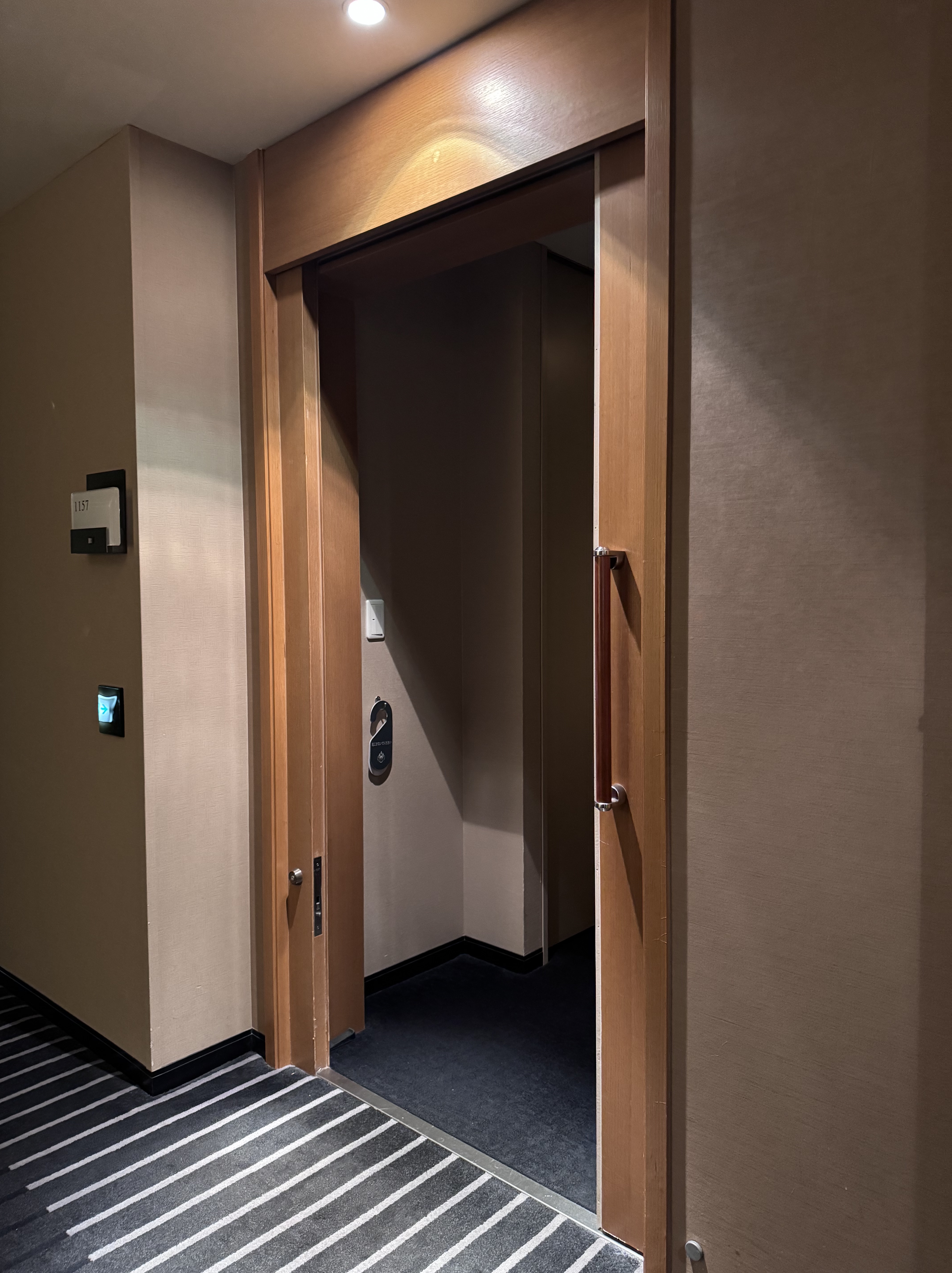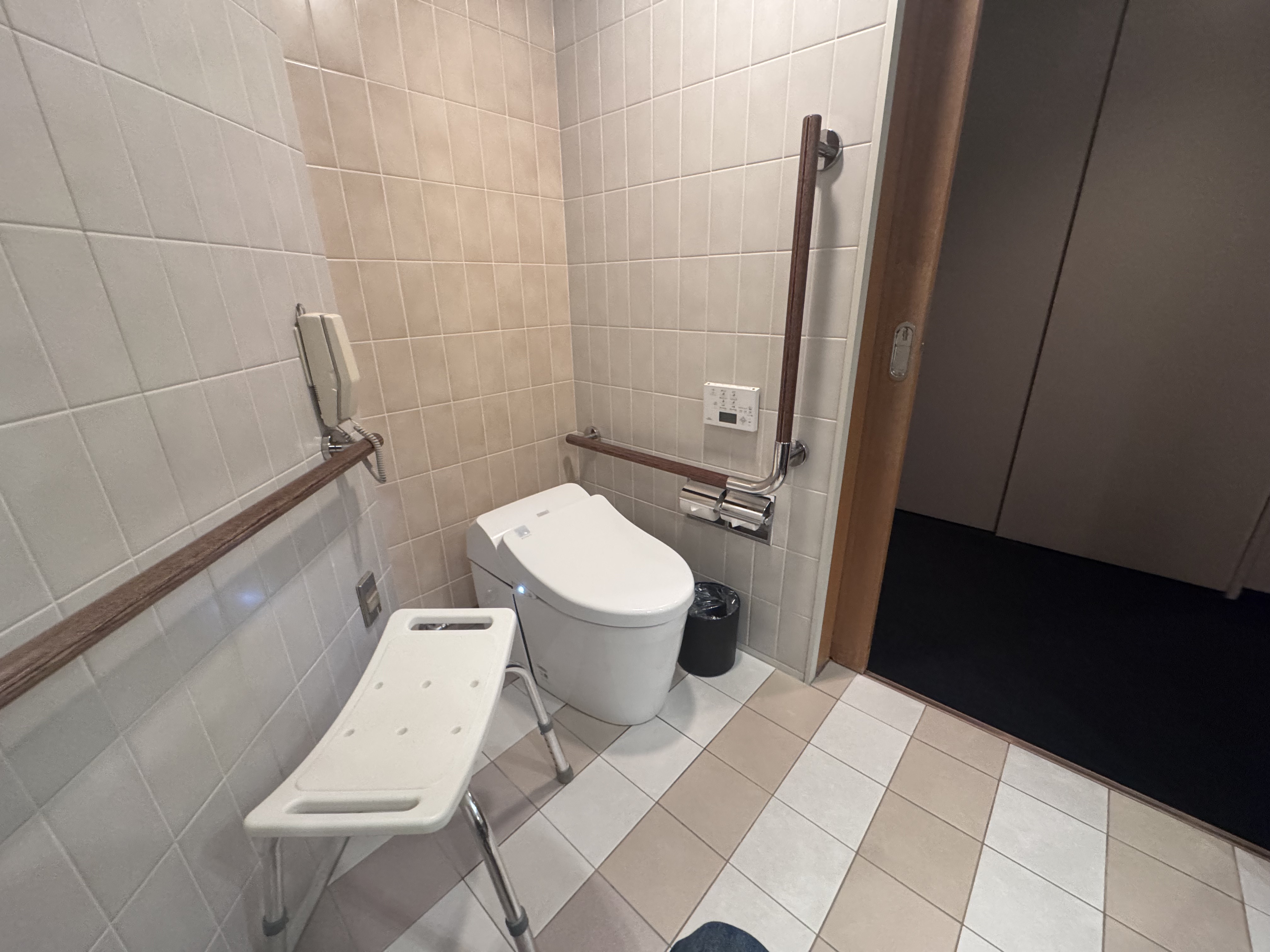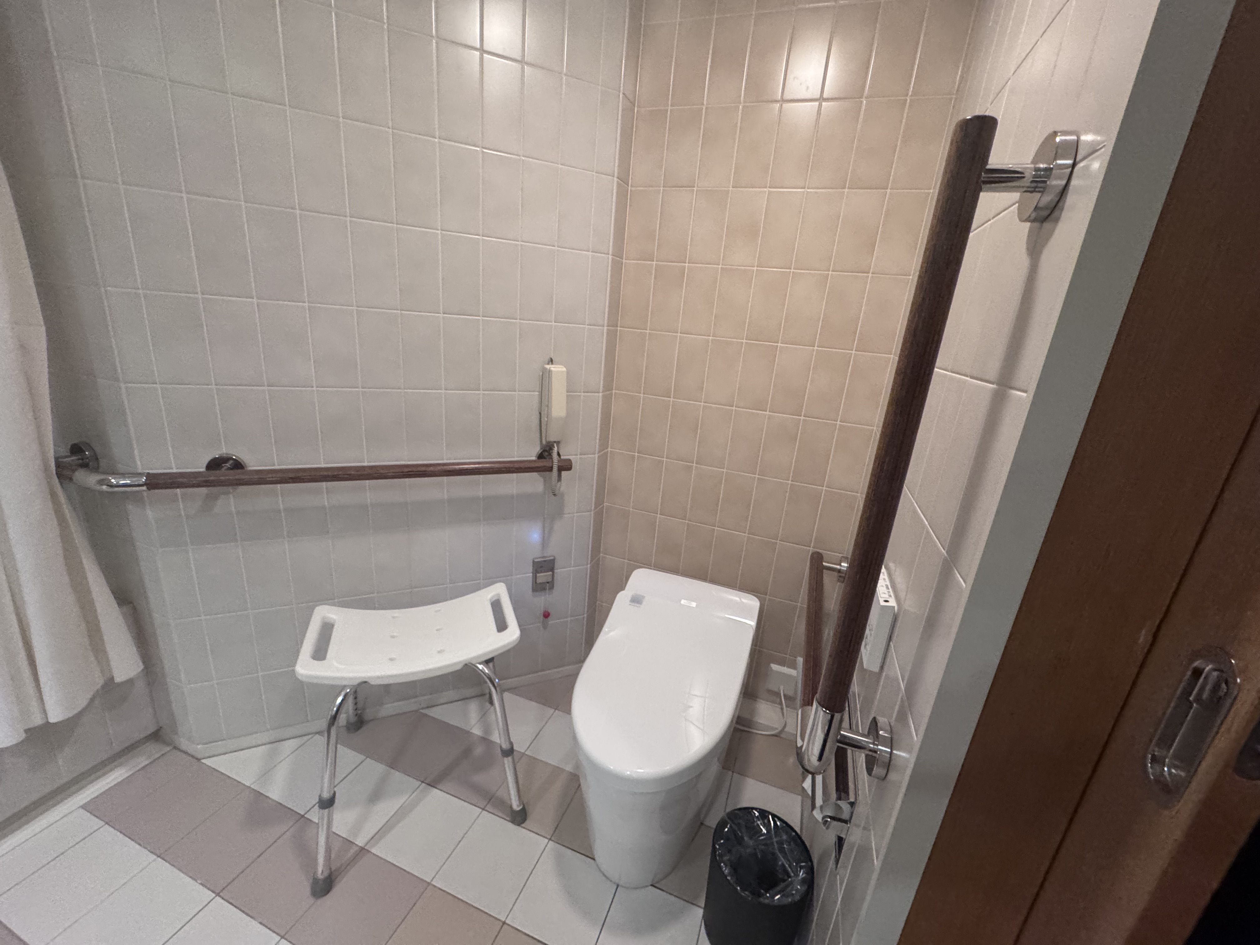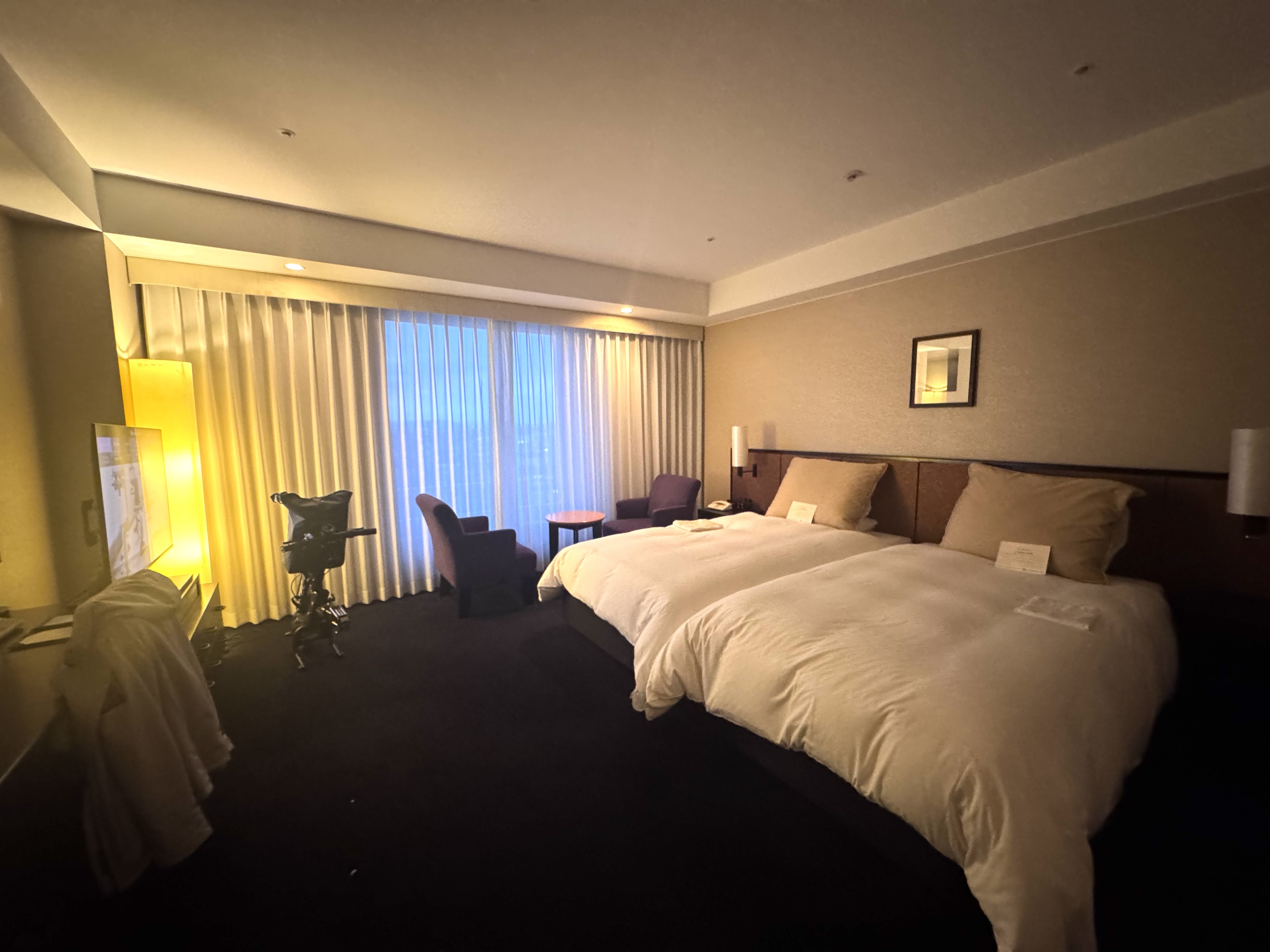 La habitación adaptada está situada justo al salir del ascensor, minimizando los recorridos por los pasillos. Es, sin duda, la habitación más grande de todo nuestro viaje por Japón: un espacio inmenso con dos camas de gran tamaño y muchísimo sitio libre para dejar maletas sin que estorben el paso de una silla. La puerta de entrada es corredera y totalmente automática facilitando la entrada.